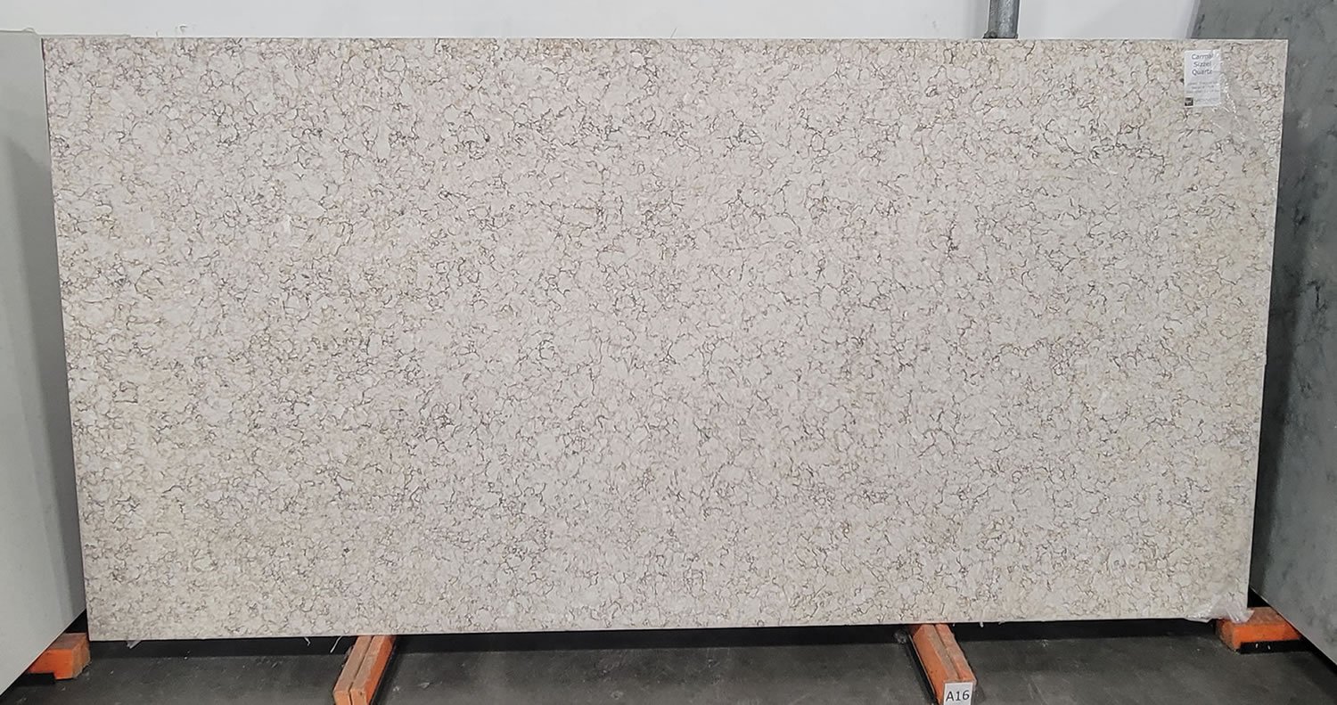 Modern-look quartz with a beige dominant color and small, intricate veining throughout.