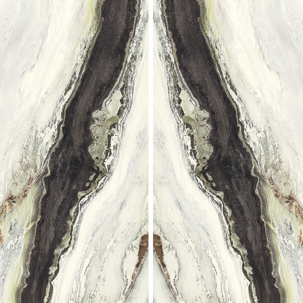 A stark contrast of colors with a dark, black vein cutting through a canvas of ivory. The secondary and tertiary colors of ash and copper give this color ample character.