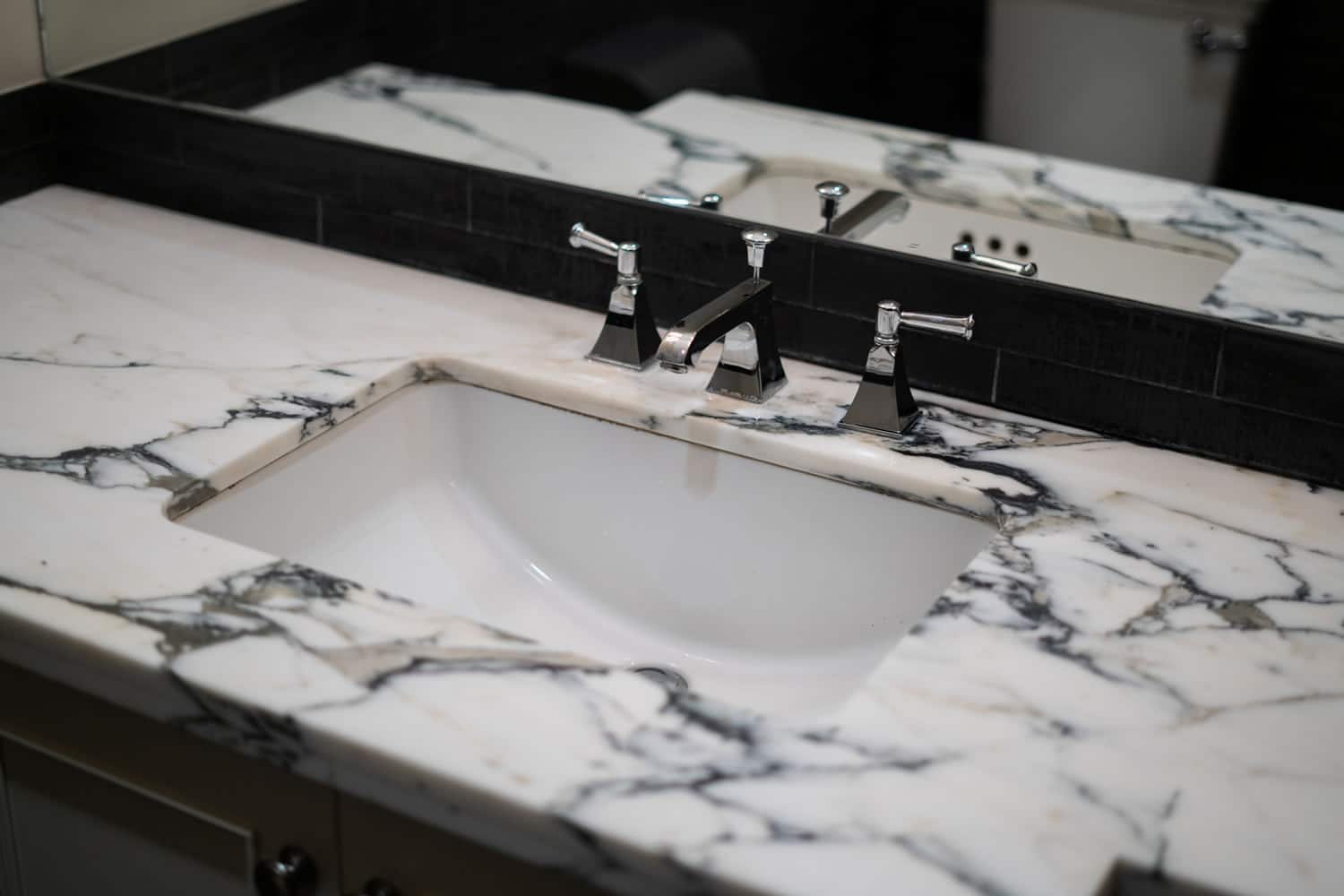 Dark, dramatic veining runs across this marble-look quartz creating a turbulent but attractive look.